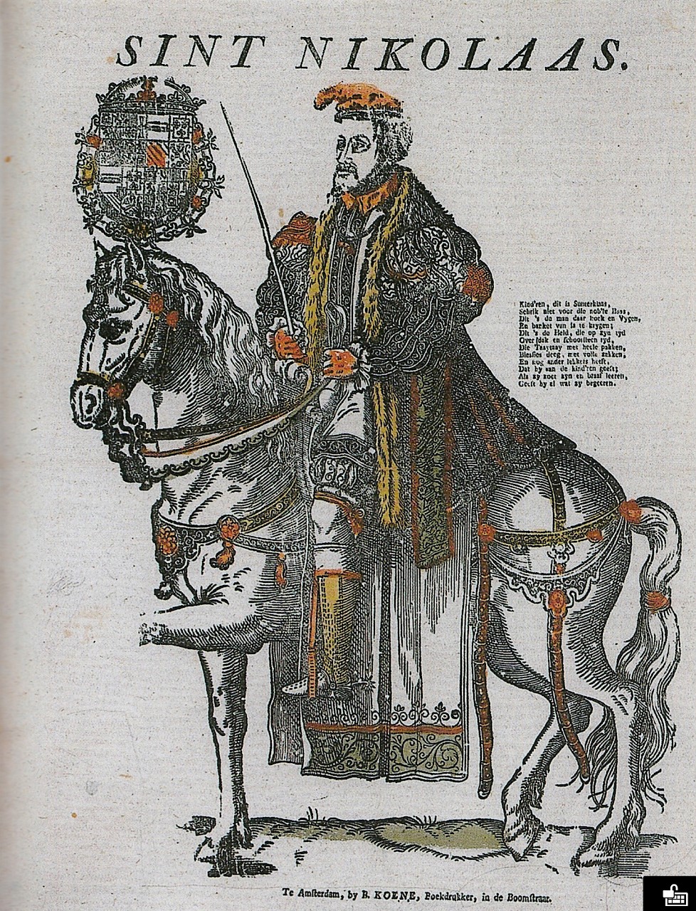 “Kind’ren, dit is Sinterklaas / Schrik niet van die nob’le Baas”. Prent, 16e eeuw, oorspronkelijk van keizer Karel V., na enige veranderingen als Sint-Nicolaas weergegeven (Rijksmuseum, Amsterdam)